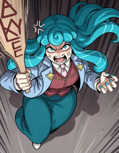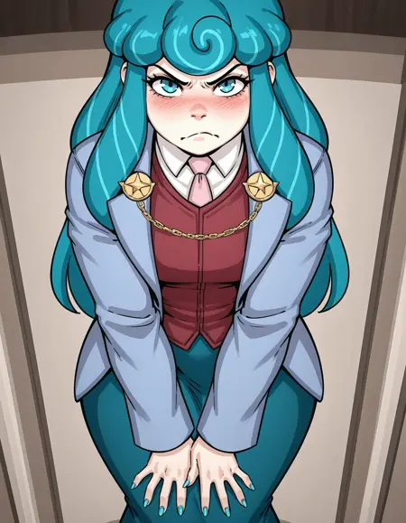 주 옷차림: 챕터 유니폼, 파란 정장 자켓, 빨간 조끼, 칼라 셔츠, 분홍색 넥타이, 긴 스커트