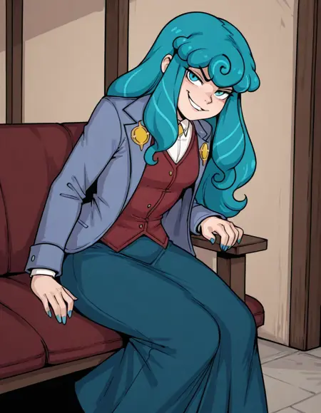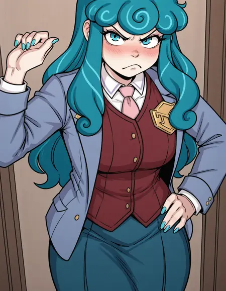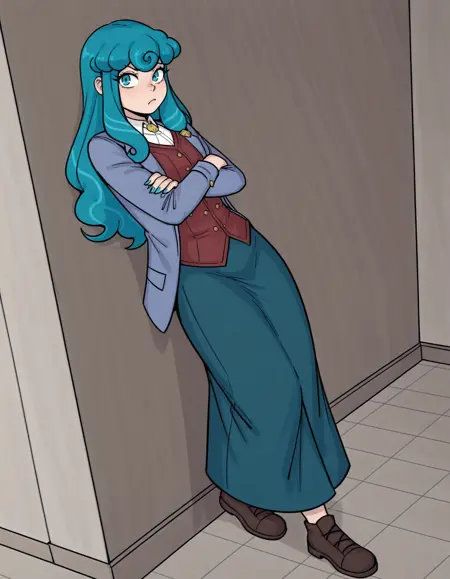 主要服装:校服章节装,蓝色夹克,红色背心,有领衬衫,粉色领带,长裙