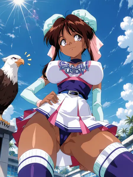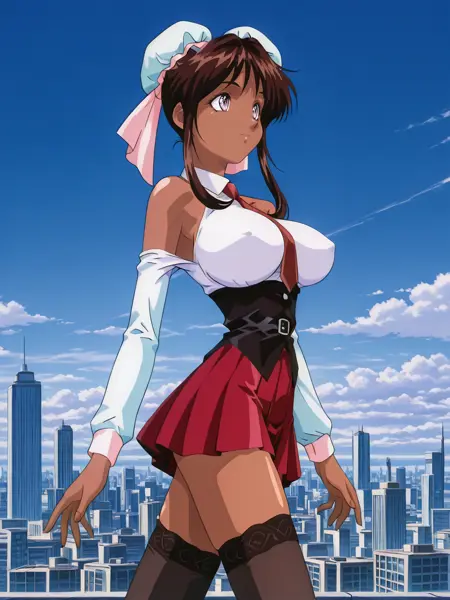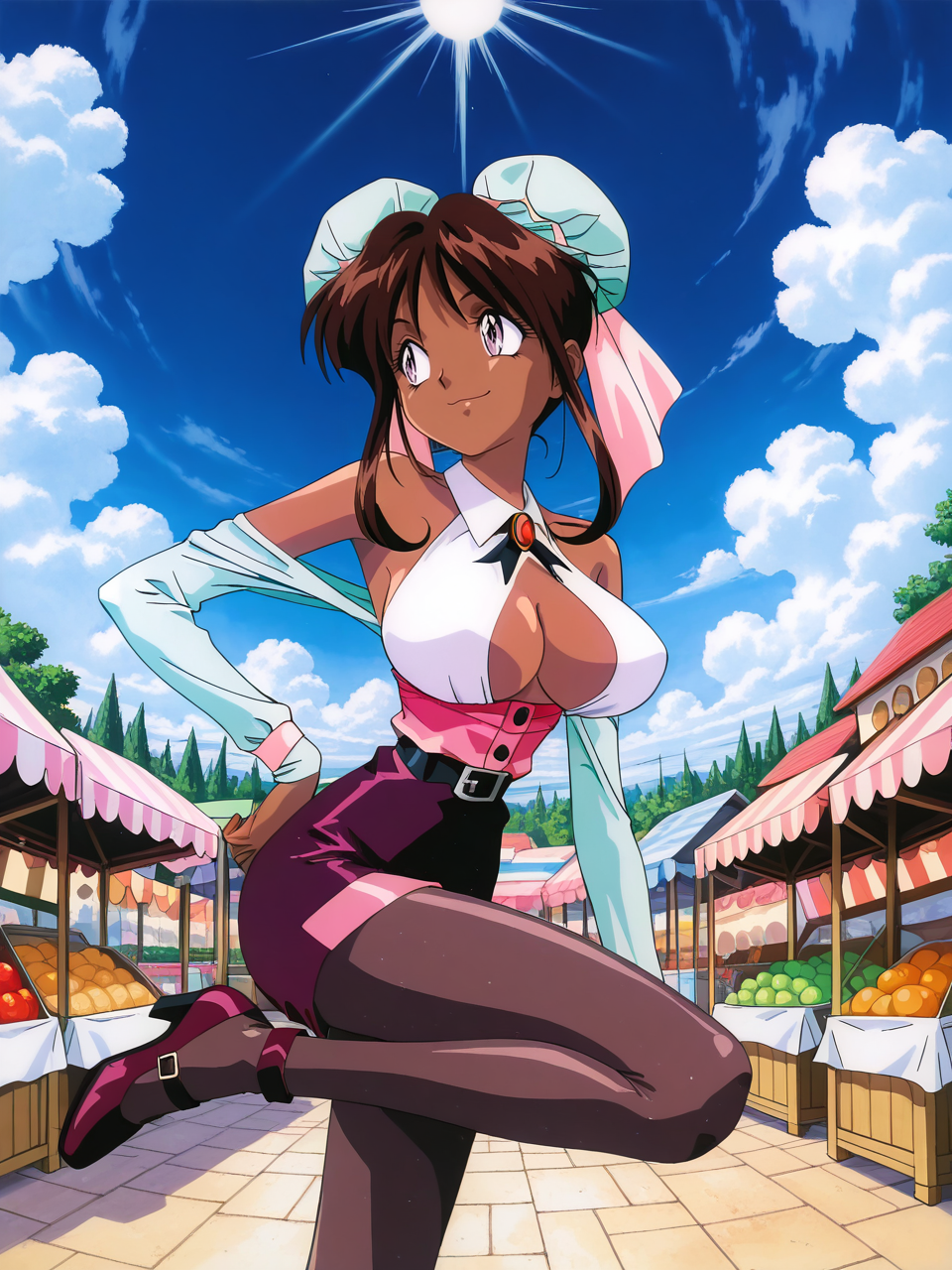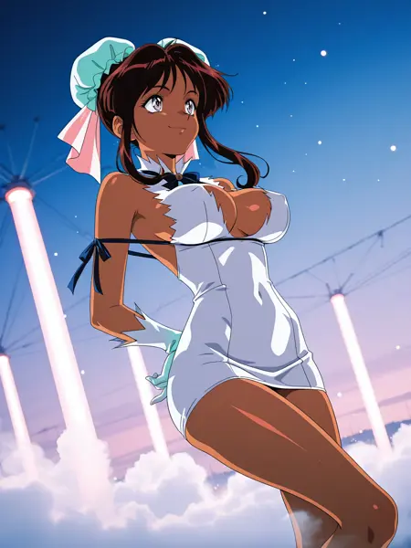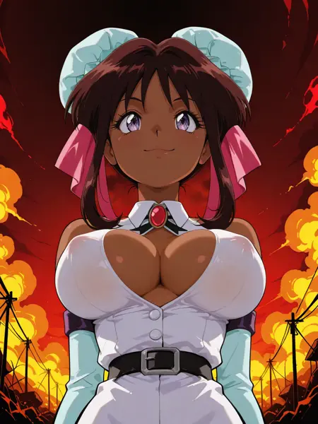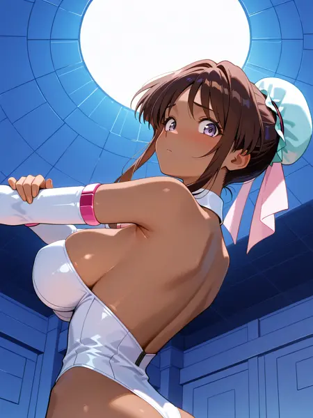 トリガー: nanvel_fw, 暗い肌の女性, (紫の目:1.1), (大きな胸:1.1), 茶色の髪, 胸, 髪の結い, 横髪, 結いカバー, ダブルバング