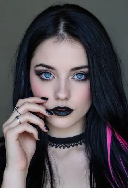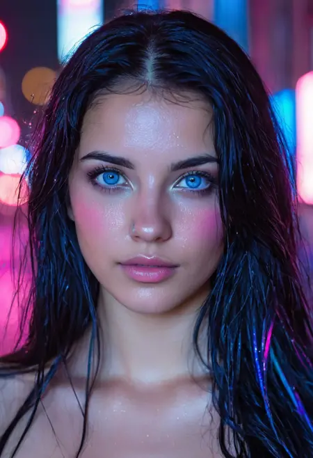 nynxR, ultra realistic portrait of a 25yo latina-german woman, pale flawless skin, deep "blue" eyes, long black hair with subtle pink streaks, symmetrical facial features, cinematic HDR contrast, masterpiece photography, ultra detailed face, high-resolution skin texture, wet skin with natural highlights, soft depth of field, dramatic moody atmosphere, 50mm f/1.8 lens, shallow DOF, high dynamic range, award-winning photography