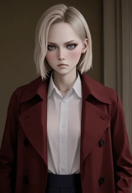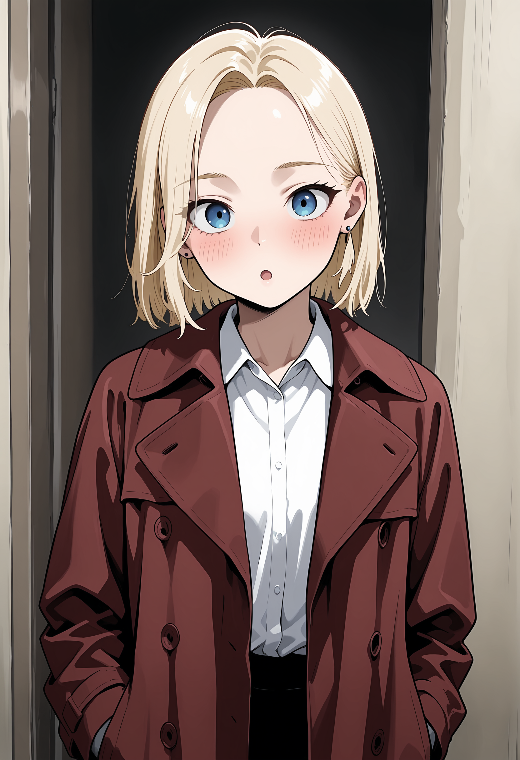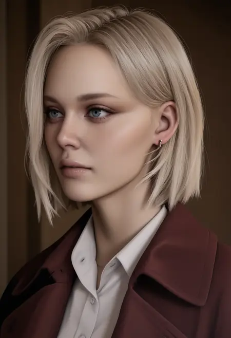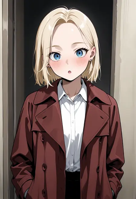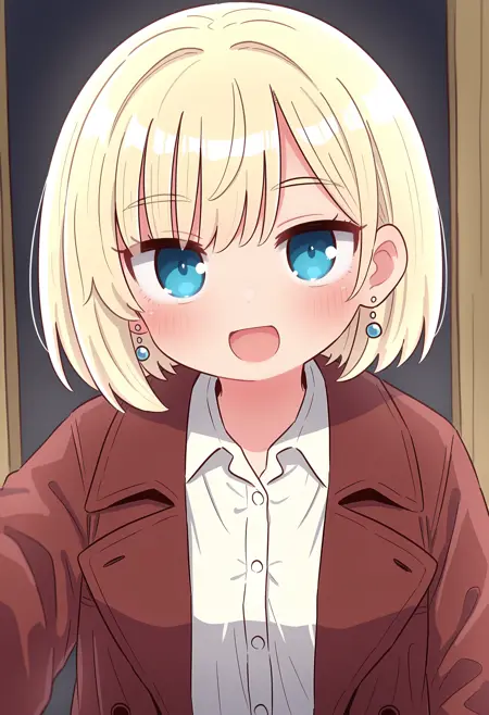 alyilf、ブロンドヘア、ショートヘア、青い目、コート、シャツ、イヤリング