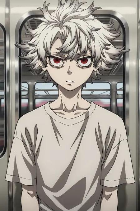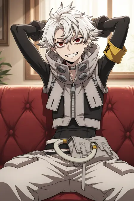 Tags: rudo_surebrec, red eyes, grey hair, white hair, short hair, spiked hair, multicolored hair, sanpaku, v-shaped eyebrows, gloves, armband, hood, pouch, zipper, zipper pull tab, jacket, belt, choker, black footwear, bodysuit, vest, collar, shoes, red socks, mouth mask