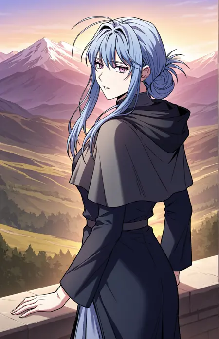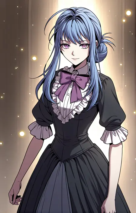 Iselyn、1人女性、単体、成熟した女性、紫色の目、薄い青色の髪、長い髪、不揃いな前髪、長い側頭部の髪、低めのガサツな結び目、ほつれた髪の毛、アホ毛、