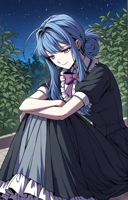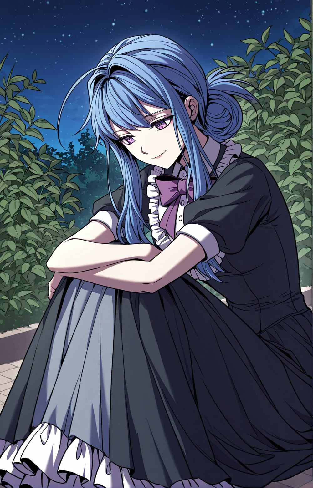 Iselynteen、1人少女、単体、紫色の目、青い髪、長い髪、不揃いな前髪、アホ毛、長い側頭部の髪、後ろ髪の結び目、ほつれた髪の毛、