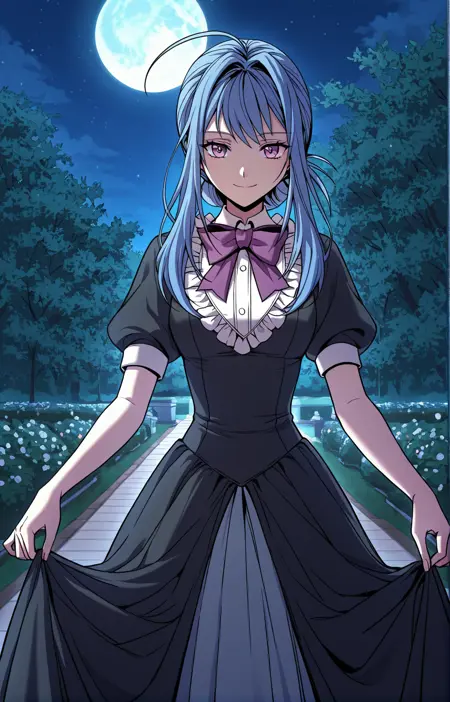 Iselynteen_outfit、黒いドレス、短い袖、白いラッフルカラー、白い前面ラッフル、紫のネックリボン、フィットしたウエスト縫い目、黒いロングアウタースカート、薄い青色のアンダースカート、白いヒミフリル、黒い靴