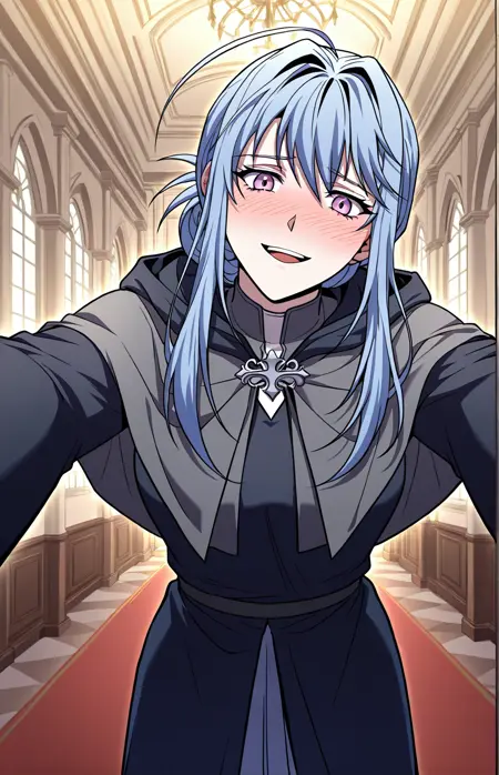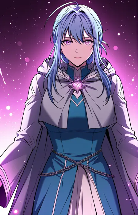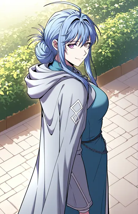 Iselyn_outfit2、薄い青色のマント、フード付きマント、宝石飾りのマント留め具、薄い青色の長い袖、青いロングコート、高めのカラー、前面スリットのローブ、フィットしたウエストベルト、白い内側スカート、チェーン付きウエスト装飾、白いブーツ、フードを下ろした状態