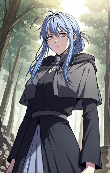 Iselyn_outfit1、濃い色のフード付きキャプリ、シルバーのキャプリ留め具、濃い色の長い袖、濃い色のローブ、前面スリットのローブ、高めのカラー、白い下着、フィットしたウエストベルト、薄い青色の内側スカート、黒いズボン、白いブーツ、フードを下ろした状態