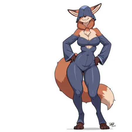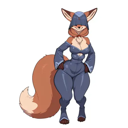 fox, fox girl, red fox, brown and tan fur, hair tied, black nose, fox ears, fox tail, slim waist, thick thighs, digigrade, large breasts, multiple breasts, blue bodysuit, bare shoulders, cleavage, boob window, blue veil, eyes covered,