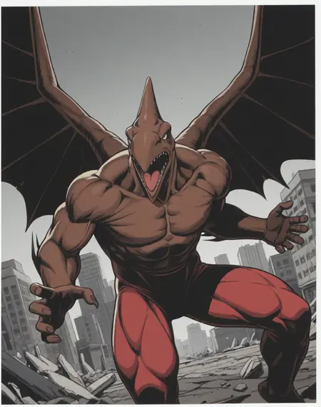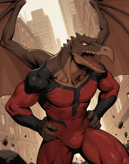 The character wears a red spandex supersuit that shows the abs and pecs bare. Superhero and supervillain suits back in the day were varied and something else compared to the ones shown these days. He also has a brown skinned scaly dinosaur body.