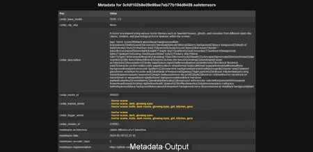 追加機能:所持しているLoRAの数を表示するカウンター。右上にヘルプメニュー(説明不要)を追加。LoRAが大量にある場合(私のように)、スクロールが面倒なので、右下に「トップへ戻る」矢印アイコンを追加しました。私が最も優れていると思う機能は、各LoRAに付属する「Triggerワードコピー」ボタンと「メタデータ表示」ボタンです。時には、作成者がCivitaiにTriggerワードを追加し忘れているため、LoRAにTriggerワードが表示されないことがあります。その場合、メタデータを確認するとヒントや実際のTriggerが見つかる可能性があります。見つからない場合は、必ず確認してください!フッターにはもう一つ小さな機能があります :-)