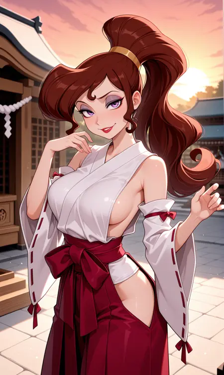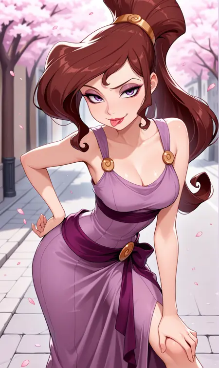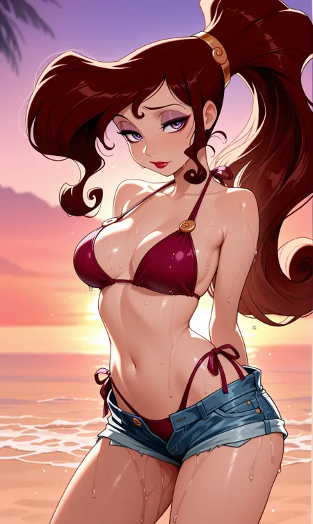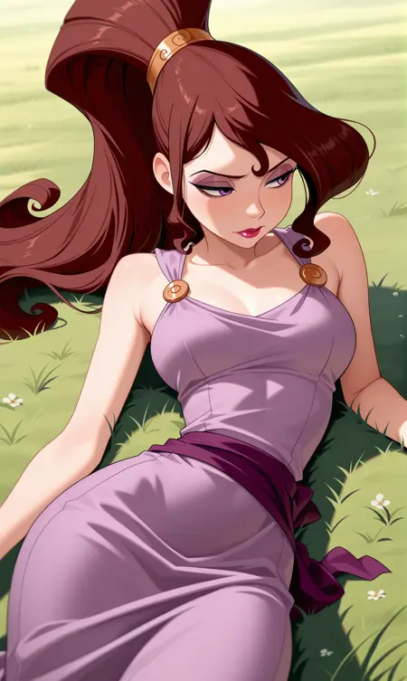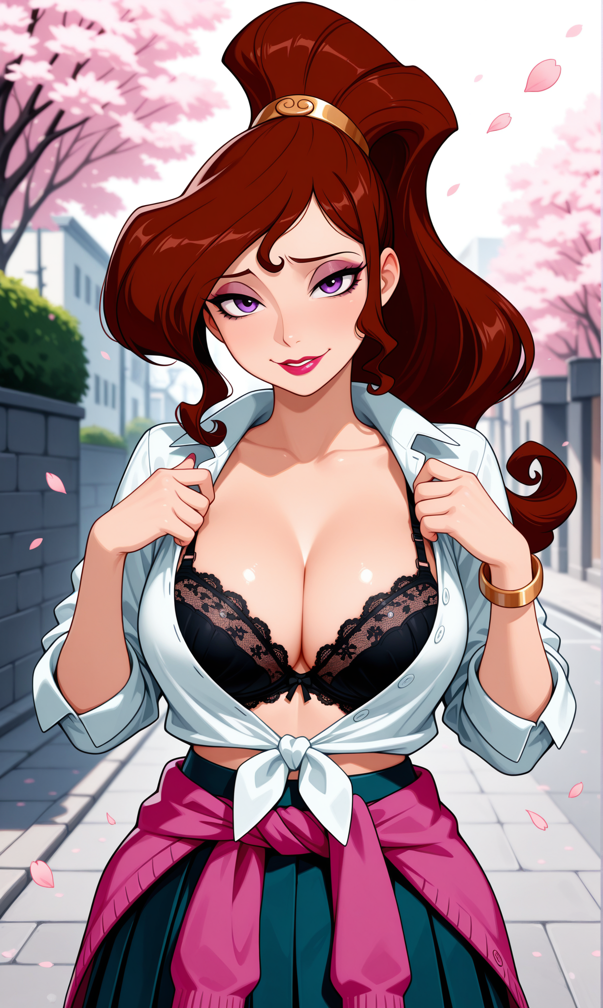 megara (디즈니), 보라색 눈, 갈색 머리, 토끼꼬리, 긴 머리, 메이크업, 아이섀도, 입술, 립스틱