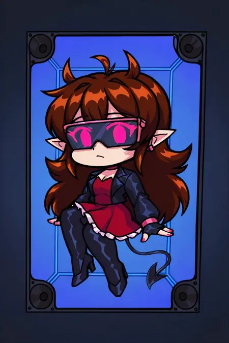 GirlfriendFNFHF, 1girl, pastel red eyes, no sclera, fuzzier auburn hair, red dress, black coat, knee-high heels, futuristic glasses, black glass frame, pointier ears, small demon tail, short, chibi,