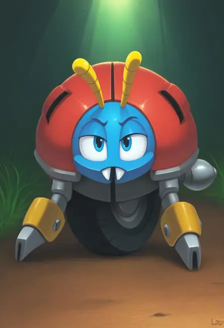 Motobug, ladybug robot, red shell with black spots, blue face, blue eyes, big wheel, no feet, no legs, yellow antennae, 2 fangs, rocket thrusters