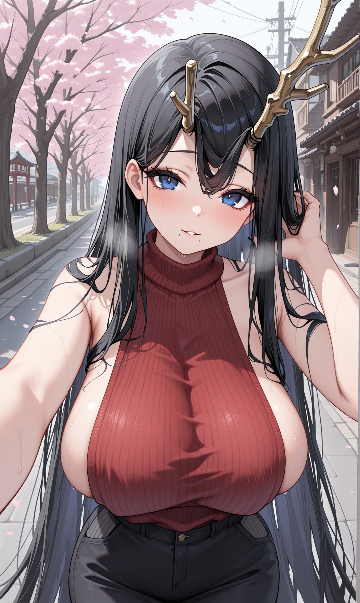 golden hind (azur lane), 파란 눈, 검은 머리, 눈 사이의 머리카락, 매우 긴 머리, 배꼽, 사슴 뿔, 사슴 뿔, 뿔, 뿔, 비대칭 뿔, 주근깨, 입 아래 주근깨, 네일포린, 손톱, 검은 손톱