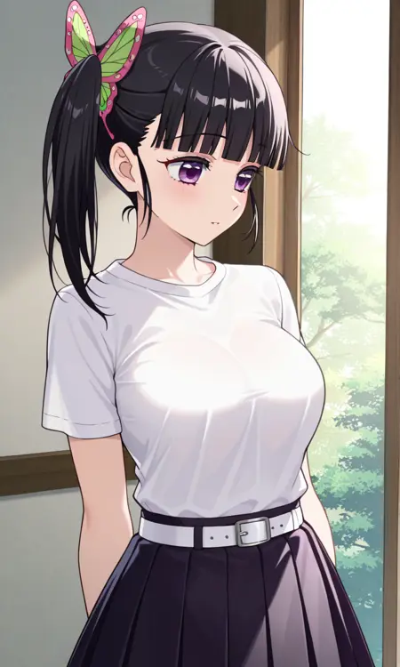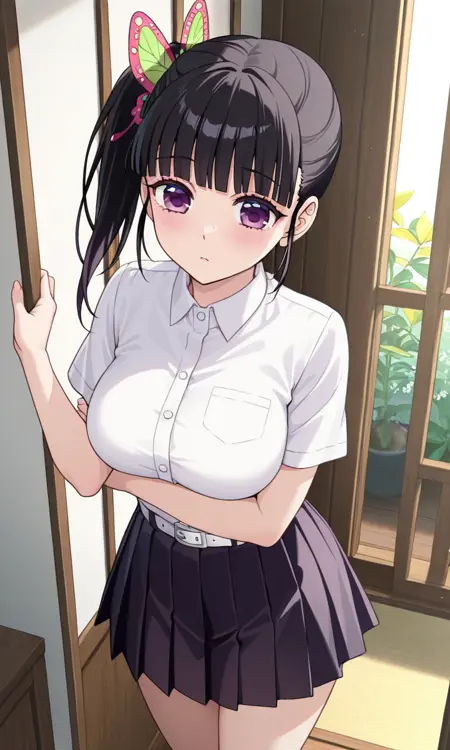 츠유리 카나오, 1소녀, 싱글, 검은 머리, 긴 머리, 보라색 눈, 뿔 모양 머리끈, 옆 뿔 모양 머리끈, 나비, 나비 머리 장식, 검은 치마, 흰 셔츠, 짧은 소매, 흰 허리띠, 접힌 치마, 미니 치마, 큰 가슴