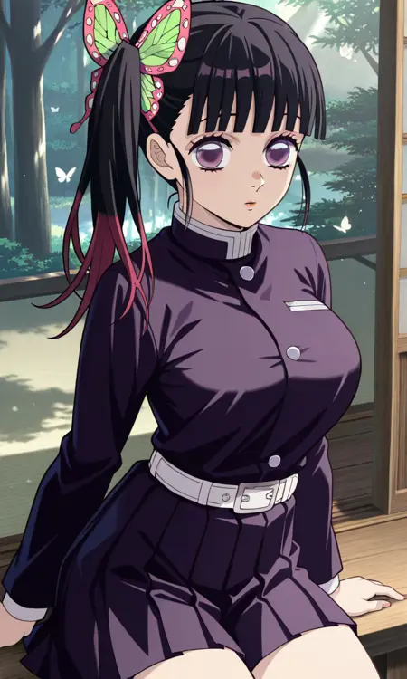 津村可奈子,1女孩,独奏,黑发,长发,紫眼,马尾,侧马尾,蝴蝶,蝴蝶发饰,黑裙,鬼杀队制服,长袖,白腰带,百褶裙,迷你裙,大乳房