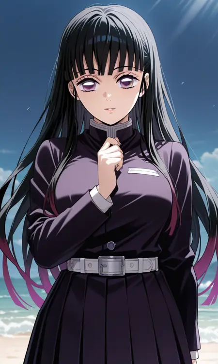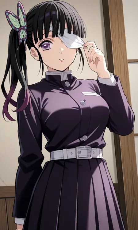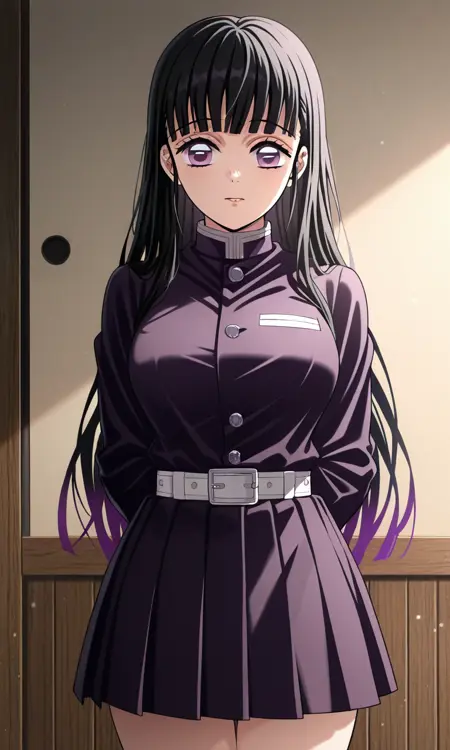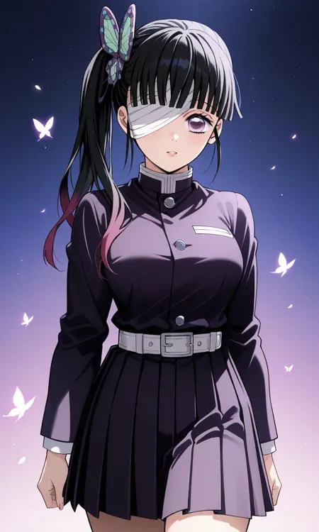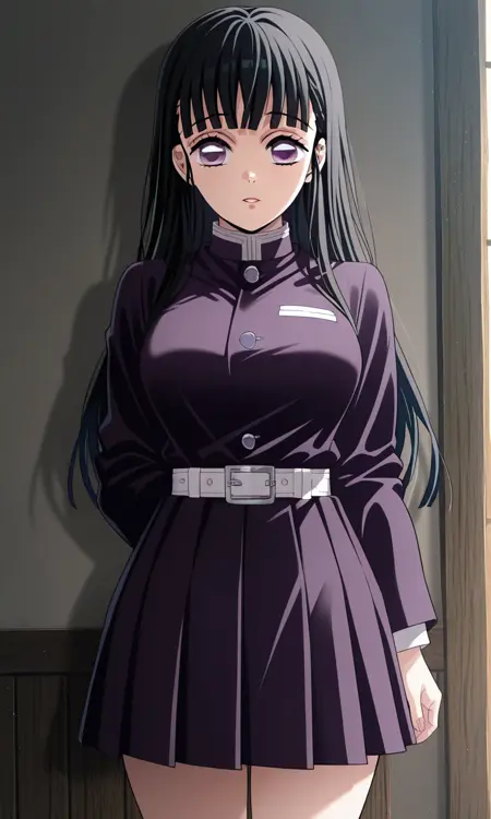 츠유리 카나오, 1소녀, 싱글, 검은 머리, 긴 머리, 보라색 눈, 뿔 모양 머리끈, 옆 뿔 모양 머리끈, 나비, 나비 머리 장식, 검은 치마, 악마 잡는이 유니폼, 긴 소매, 흰 허리띠, 접힌 치마, 미니 치마, 큰 가슴