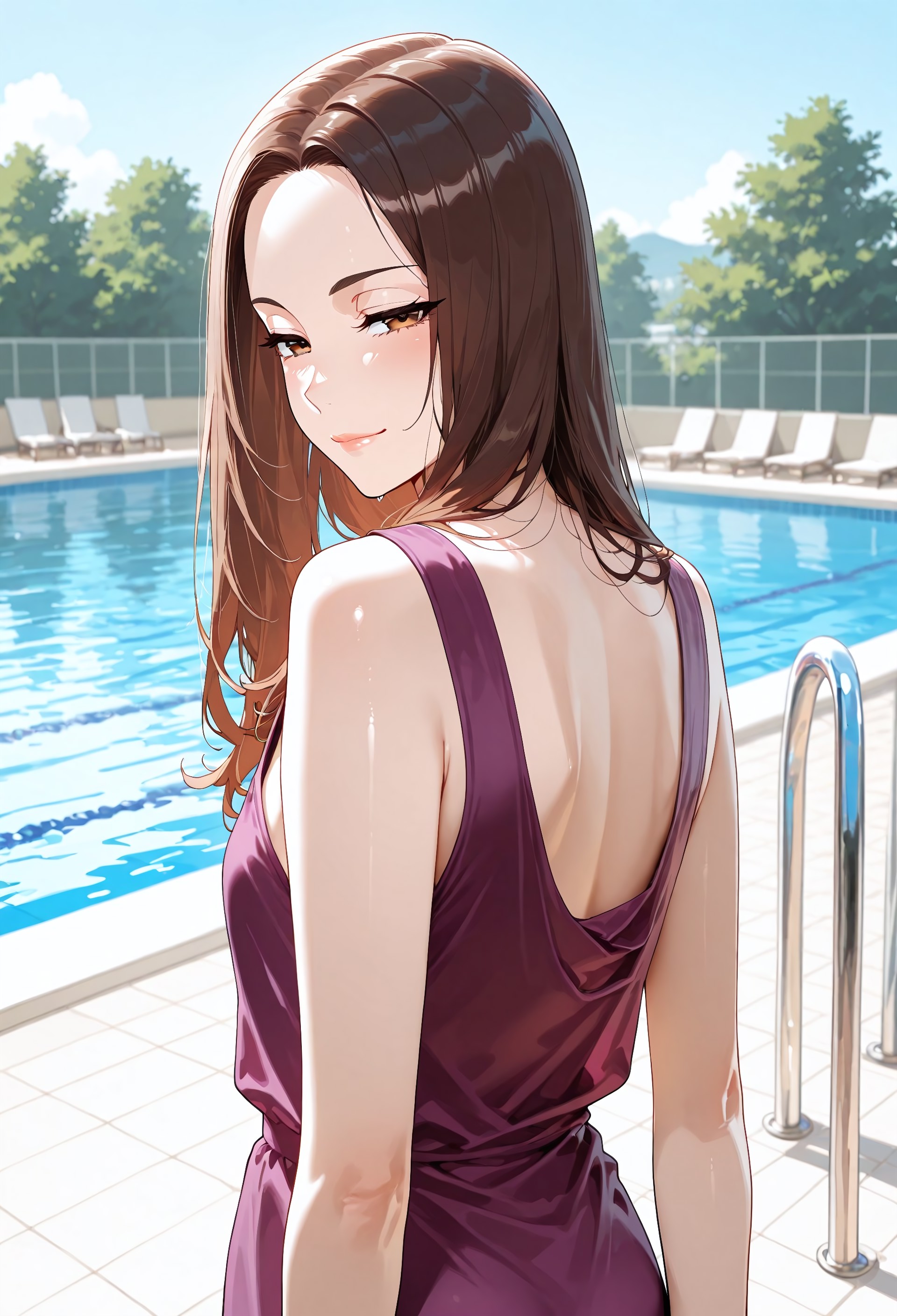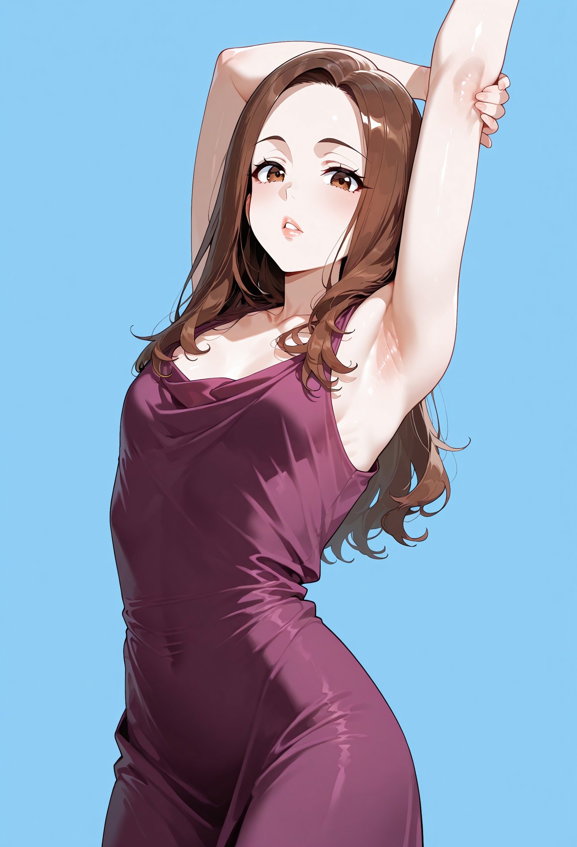 nor_g1rl, 1girl, solo, brown hair, long hair, brown eyes, lips, collarbone, small breasts, dress, purple dress, sleeveless dress