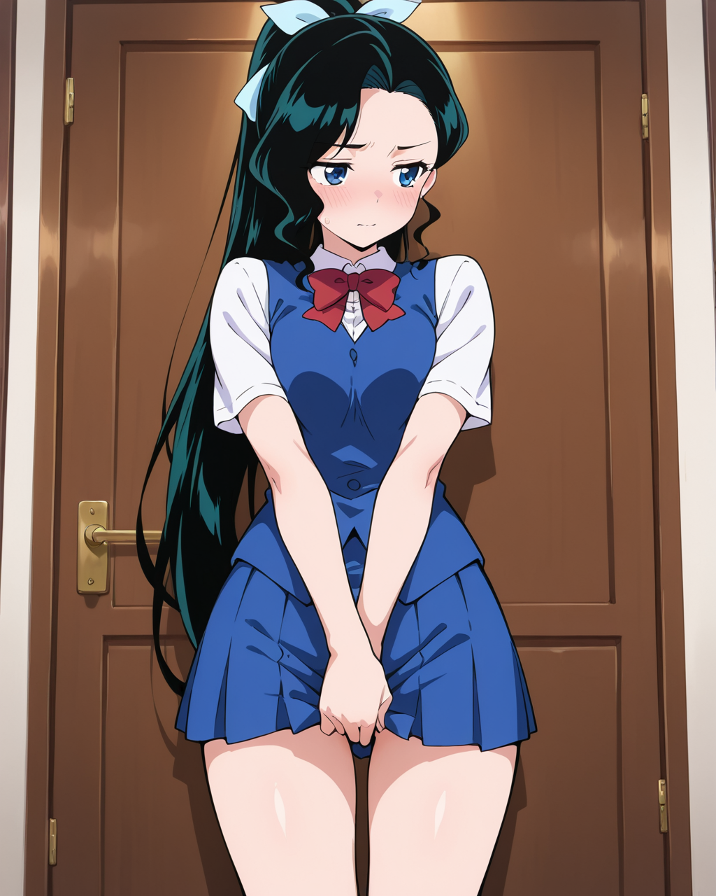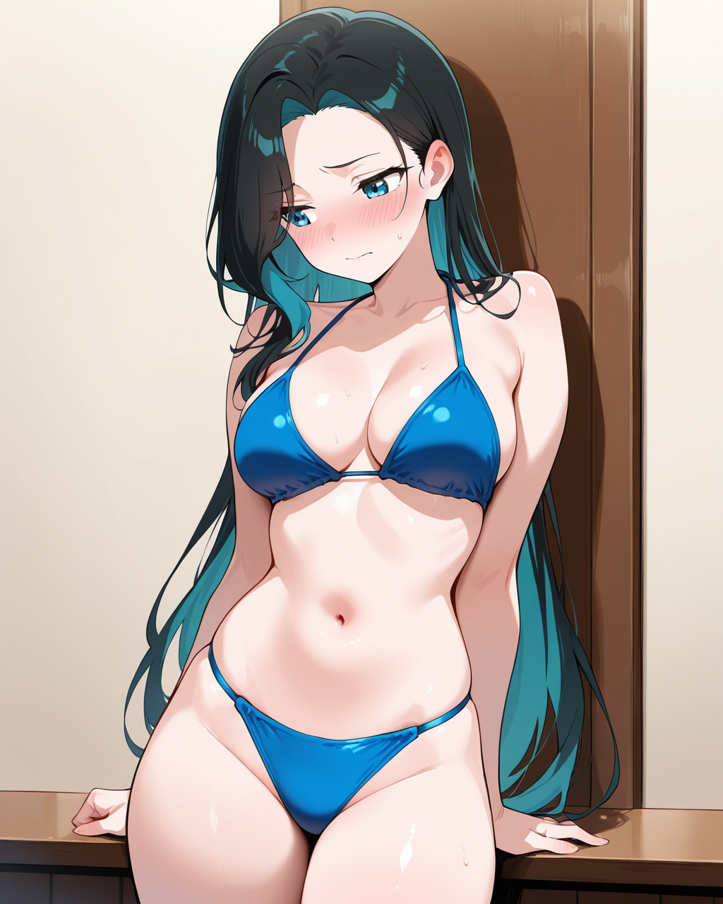 Ai Shinozaki, Shinozaki, black with bluish highlights hair, solo, swimsuit, bikini, blue bikini, blush, embarrassed, breasts