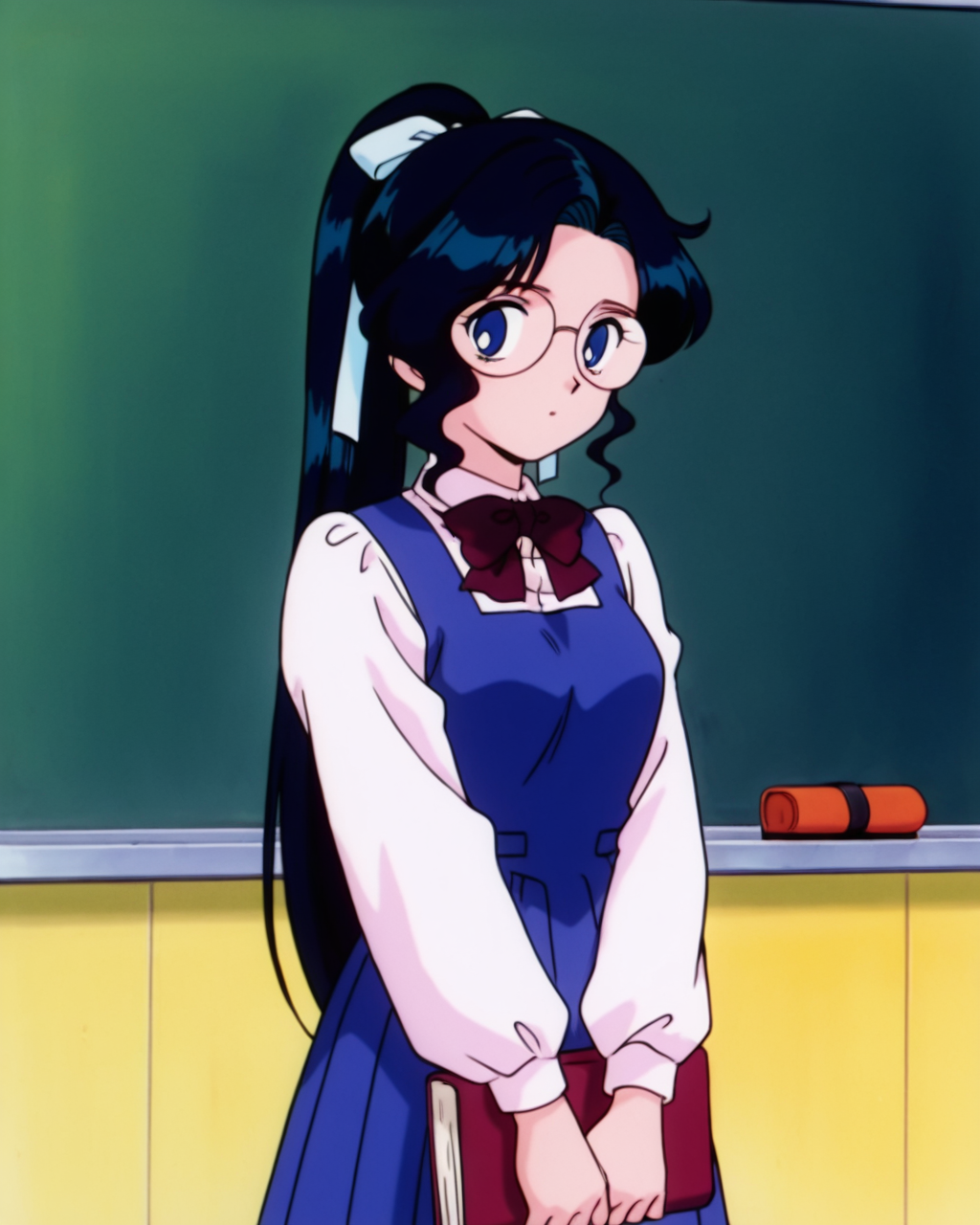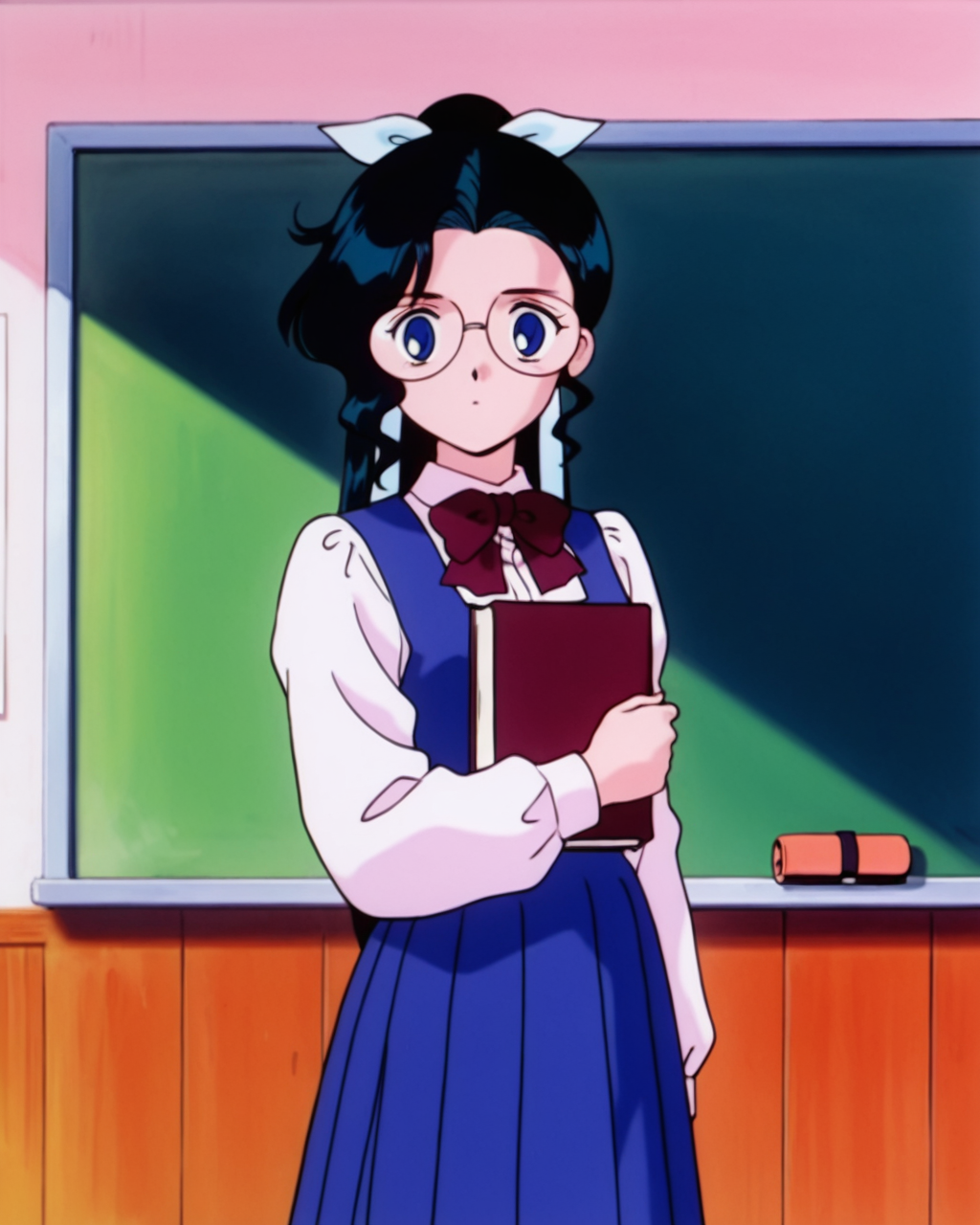 Ai Shinozaki, Shinozaki, deep blue eyes, black with bluish highlights hair, 1girl, solo, glasses, long hair, dress, book, shirt, chalkboard, bow, long sleeves, white shirt, ribbon, holding, school uniform, looking at viewer, standing, blue dress, indoors, bowtie, hair ribbon