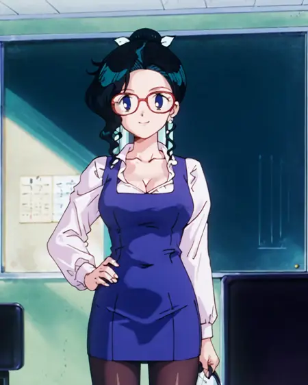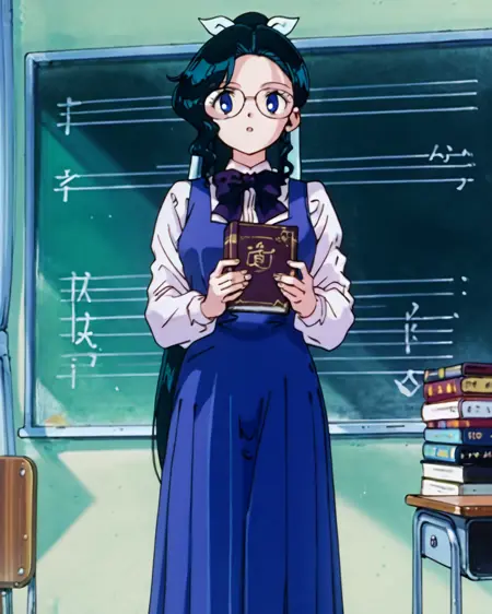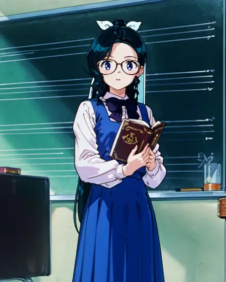 • Ai Shinozaki, Shinozaki, 진한 파란 눈, 검은 머리에 청록색 하이라이트, 1소녀, 솔로, 안경, 긴 머리, 드레스, 책, 셔츠, 칠판, 리본, 긴 소매, 흰색 셔츠, 리본, 들고 있음, 학교 유니폼, 시청자 보는 시선, 서 있음, 파란 드레스, 실내, 넥타이, 머리 리본