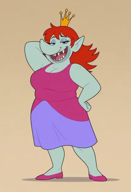 薄い緑色のチャートレーズ肌、目立つ長く鼻のような膨らんだ鼻、太ってボリュームがあり、曲線的で豊かな体型、小さな金色の王冠、大きな薄い青い虹彩と重いまぶた、5時シャドウ、不規則な歯を持つ広く開いた口、尖った耳、