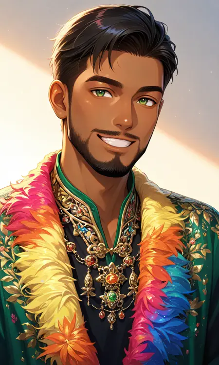 1boy,tan,dark-skinned male,short hair,black hair,beard,moustache,green eyes,collared shirt,purple shirt,pinstripe shirt,jeans