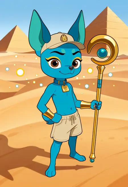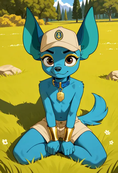 Miguel(RBUK),anthro,furry,solo, chihuahua,male,Yellow eyeshadow,blue fur,big brown eyes,black eyebrows, turquoise inner ears,beige cap,gold wristbands,Shirtless, golden and blue collar,gold tag,beige shorts with blue and yellow Details,blue tail