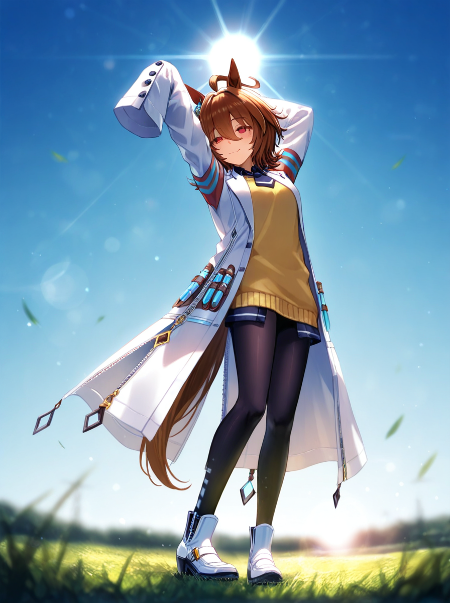 - 马耳、袖子过腕、马尾、白色短靴、黑色紧身裤、试管、黄色针织背心、单耳环、微笑、软木塞、黑色短领结、敞开外套、白色实验服、长袖