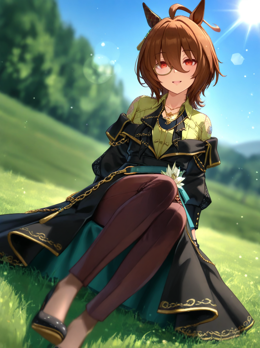 - 马尾、点状图案闭头高跟鞋、尾巴穿过衣物、棕色长裤、Σ实验、高马尾、单眼放大镜、金链、单只黑色蕾丝耳罩、侧边透明黑色朱丽叶长袖、露肩黑色长外套、低背渐变丝带、蓝色腰带、及踝袜、单只黑色半指手套