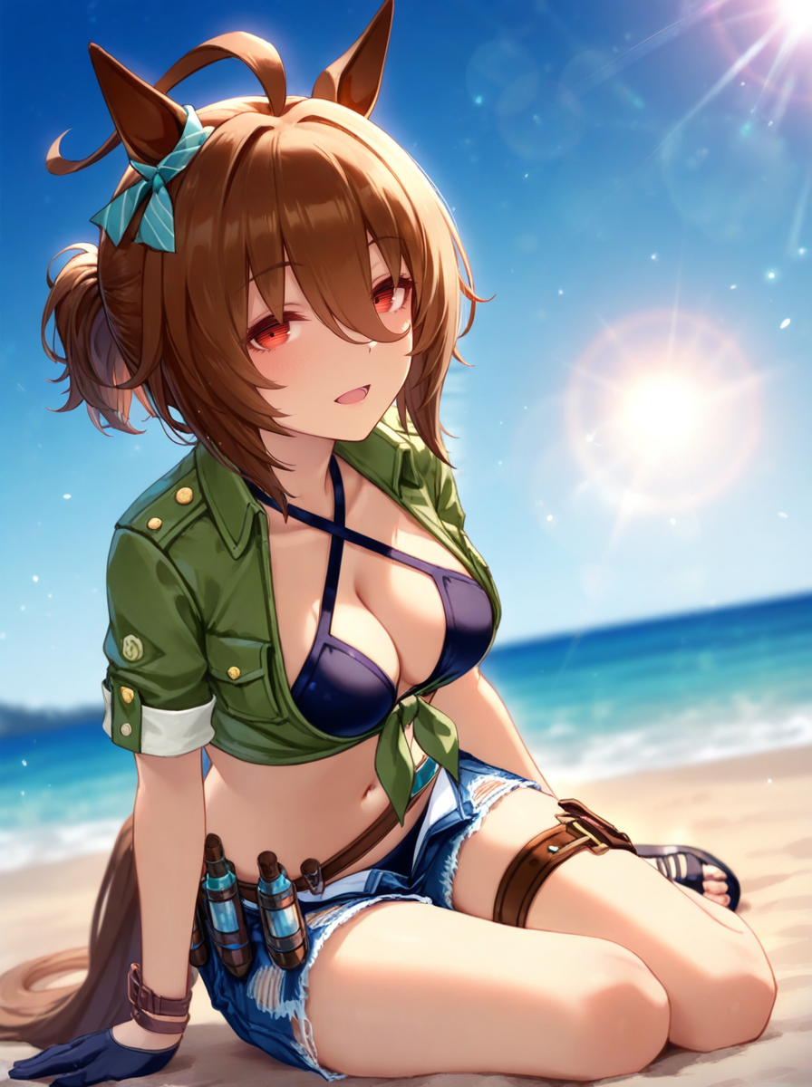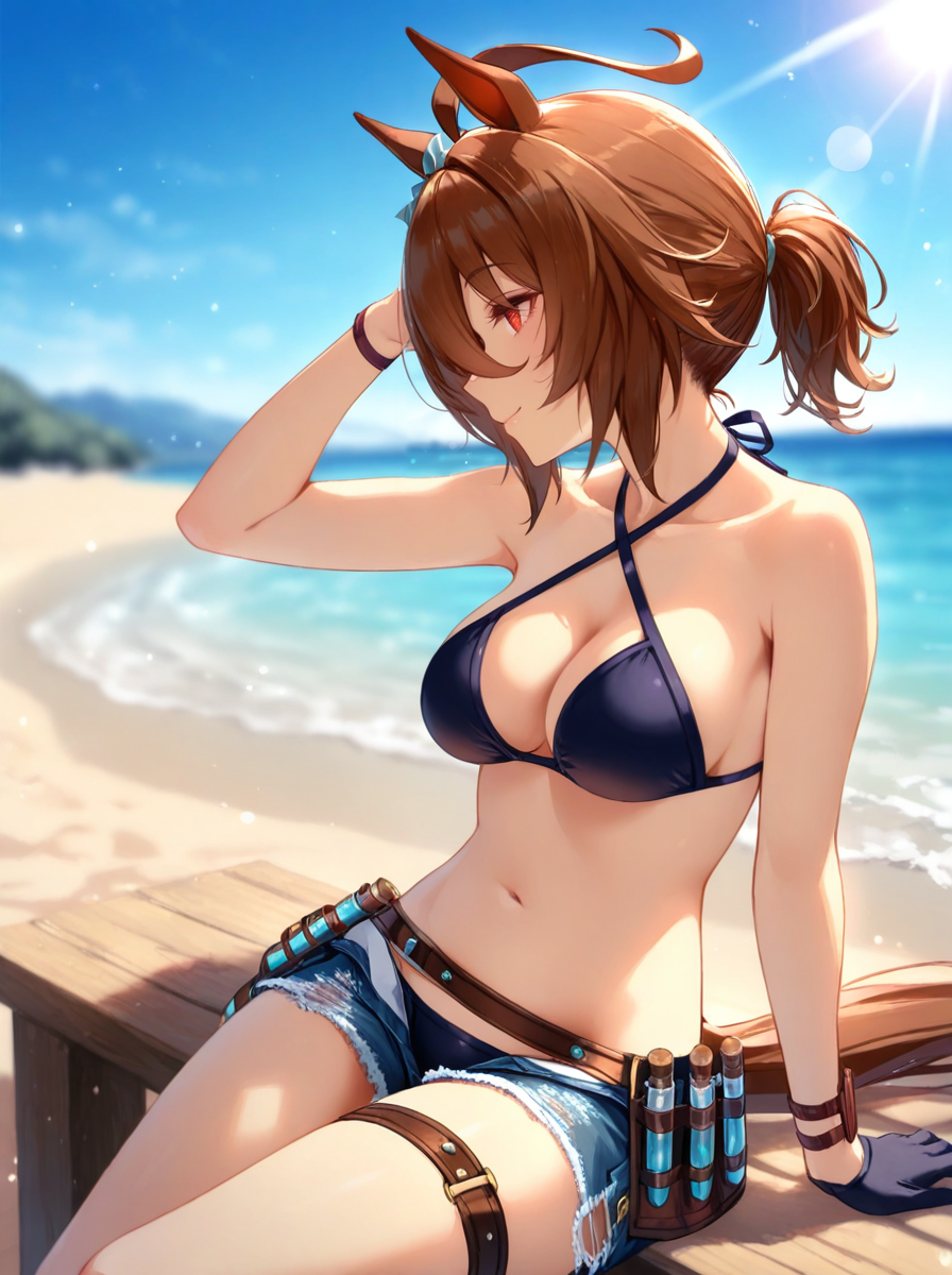 - 绿色系带夹克、敞开式裤门、烧瓶、马耳、圆底烧瓶、撕破的牛仔短裤、吊带黑色比基尼、肚脐、黑色靴子凉鞋、马尾、露腹、单只黑色手套、内衣下比基尼、黑色腰带、试管、胸部显露、袖子卷起、短马尾、单条棕色大腿带、疯狂实验室、腰带包、单条蓝色条纹耳带