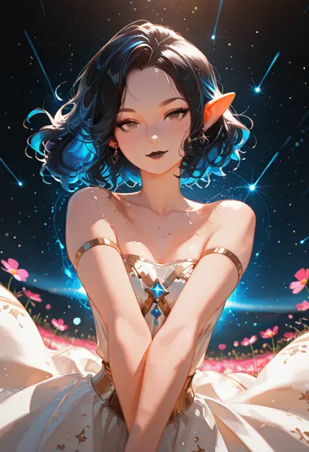 一位空灵的美女,拥有流动的黑蓝色卷发、尖耳和深邃的哥特式装饰。她如活生生的艺术般移动,迷人而遥远,她的目光挑衅着你去崇拜她。她从自然的温暖中获得喜悦,并将每一刻都化为一场表演。