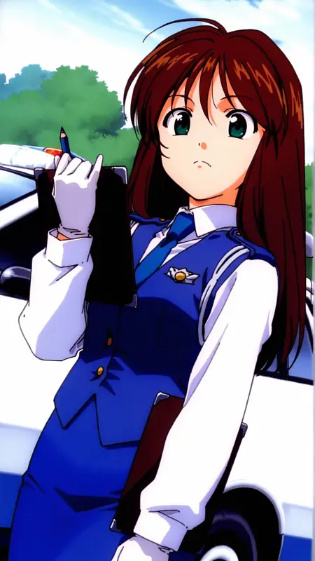 服装:警服,长袖,蓝色背心,蓝色领带,白色手套,白色衬衫,蓝色铅笔裙,