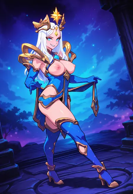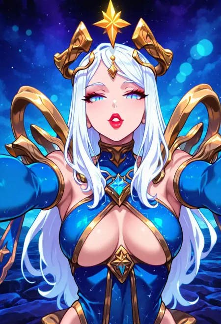 CEWhitemaneHoTS, 1girl, solo, curvy body, white hair, long hair, shine golden crown, gem, hair ornament, blue eyes, makeup, full lips, lip gloss, blue shiny dress, cleavage cutout, large breasts, blue elbow gloves, golden shoulder pads, thick thighs, large butt, blue thigh boots, high heels, large magic staff with star,