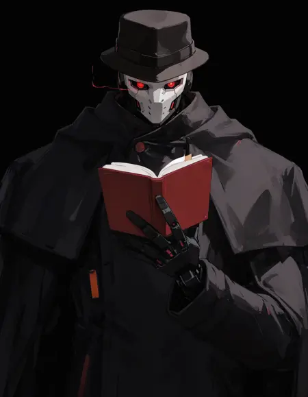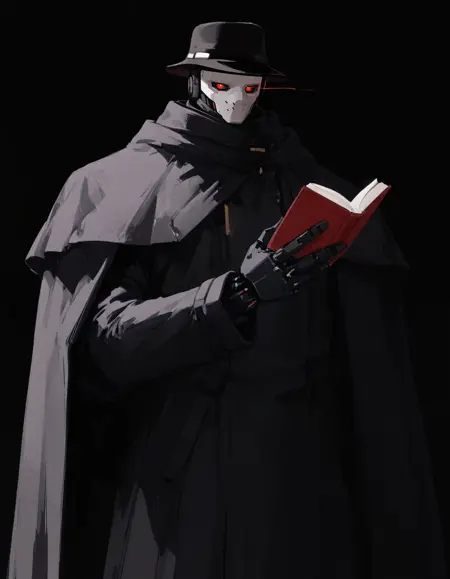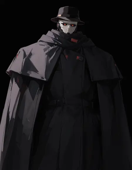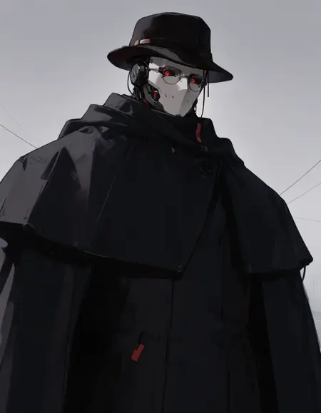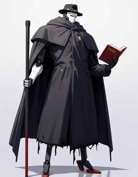 mai_pgr_gabriel,humanoid_robot,black_headwear,fedora,trench-coat,black_coat,black_cape,single_mechanical_arm,claws,holding_cane