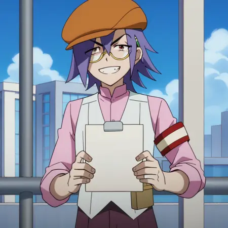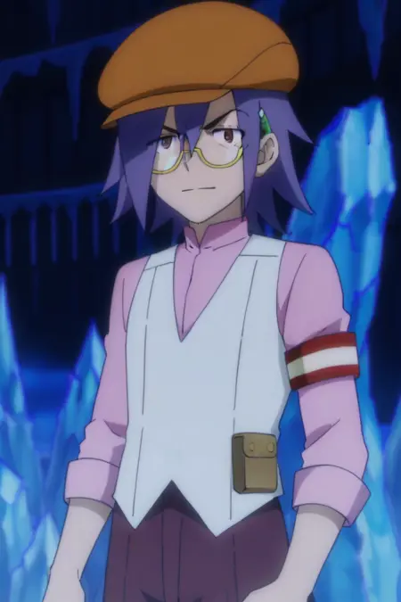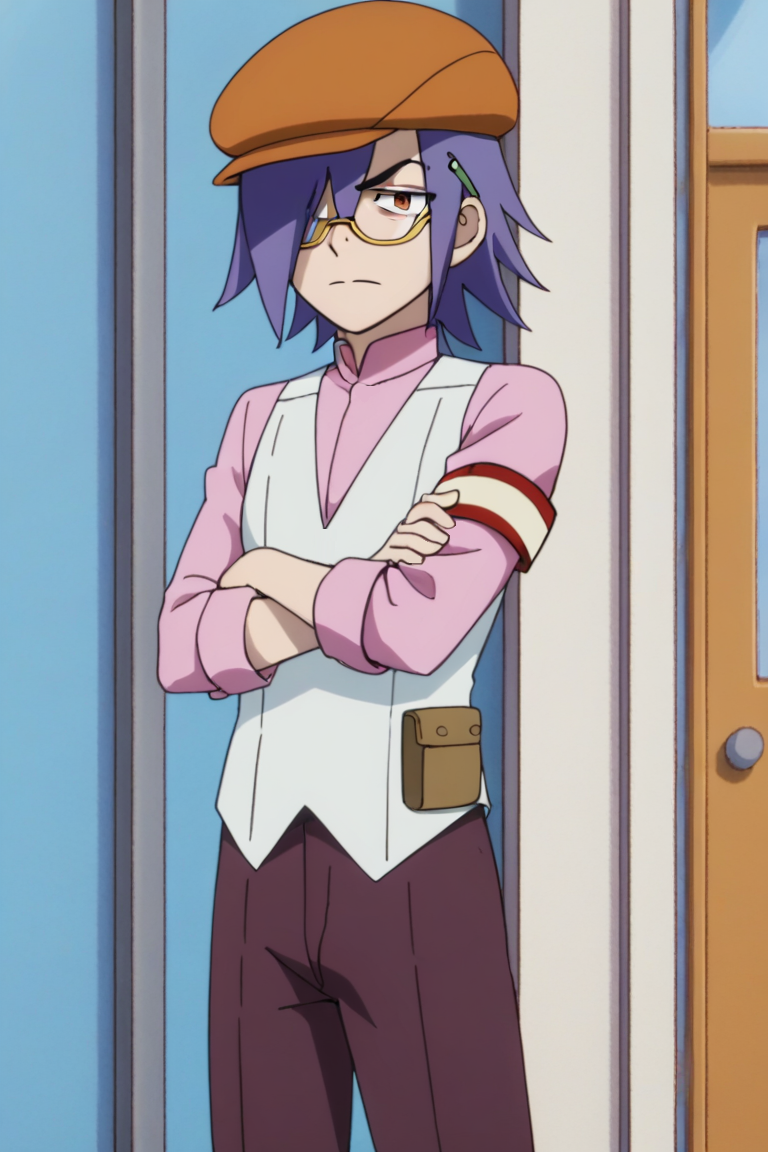프롬프트: 남성, 보라색 머리카락, 캐비 햇, 붉은 눈, 안경, 왼쪽 귀에 연필, 조끼, 분홍색 칼라 셔츠, 한쪽 팔에 팔밴드, 바지, 검은 로퍼, 실내(지하실), 야외(마을/거리/문), 조종석/창문/우주, 동굴 내부/얼음/결정(루그의 우주선용), 빨간 배경/불