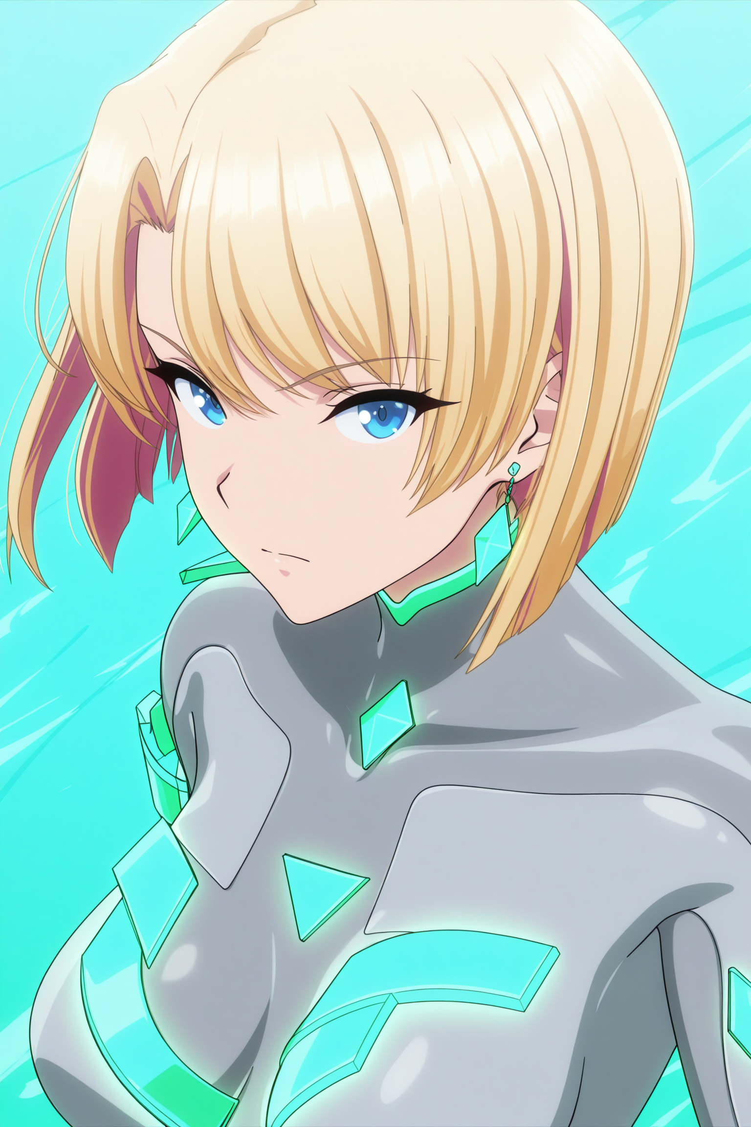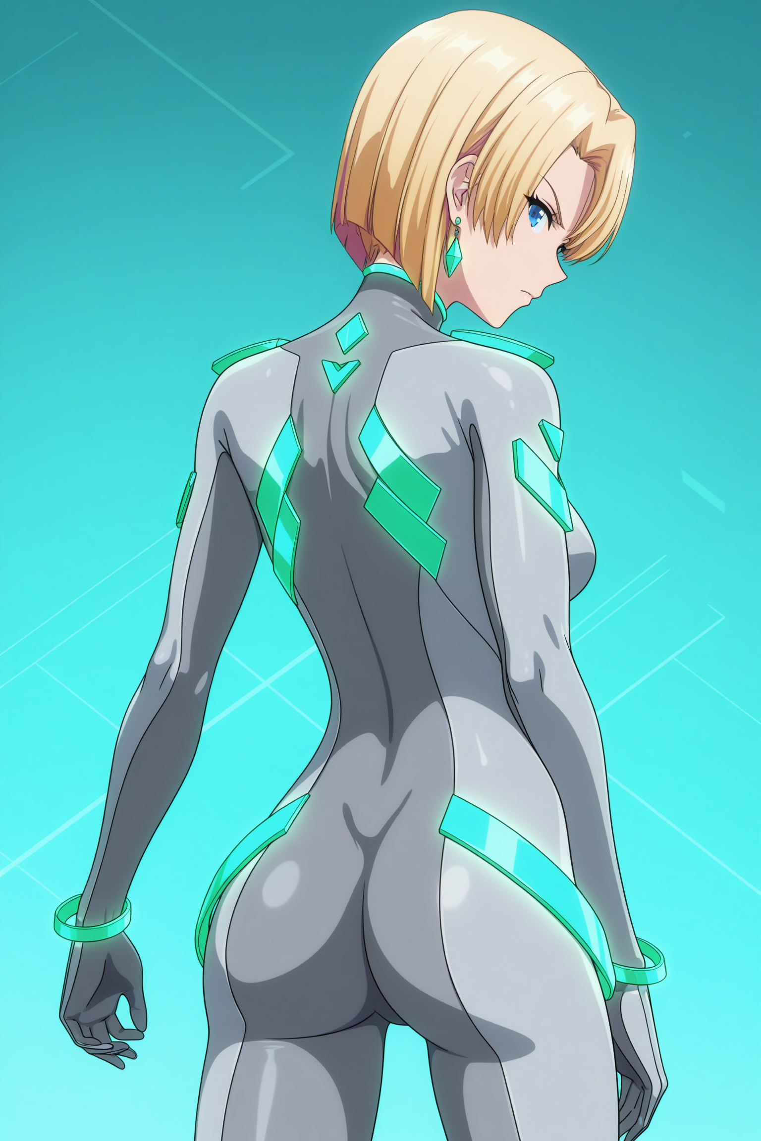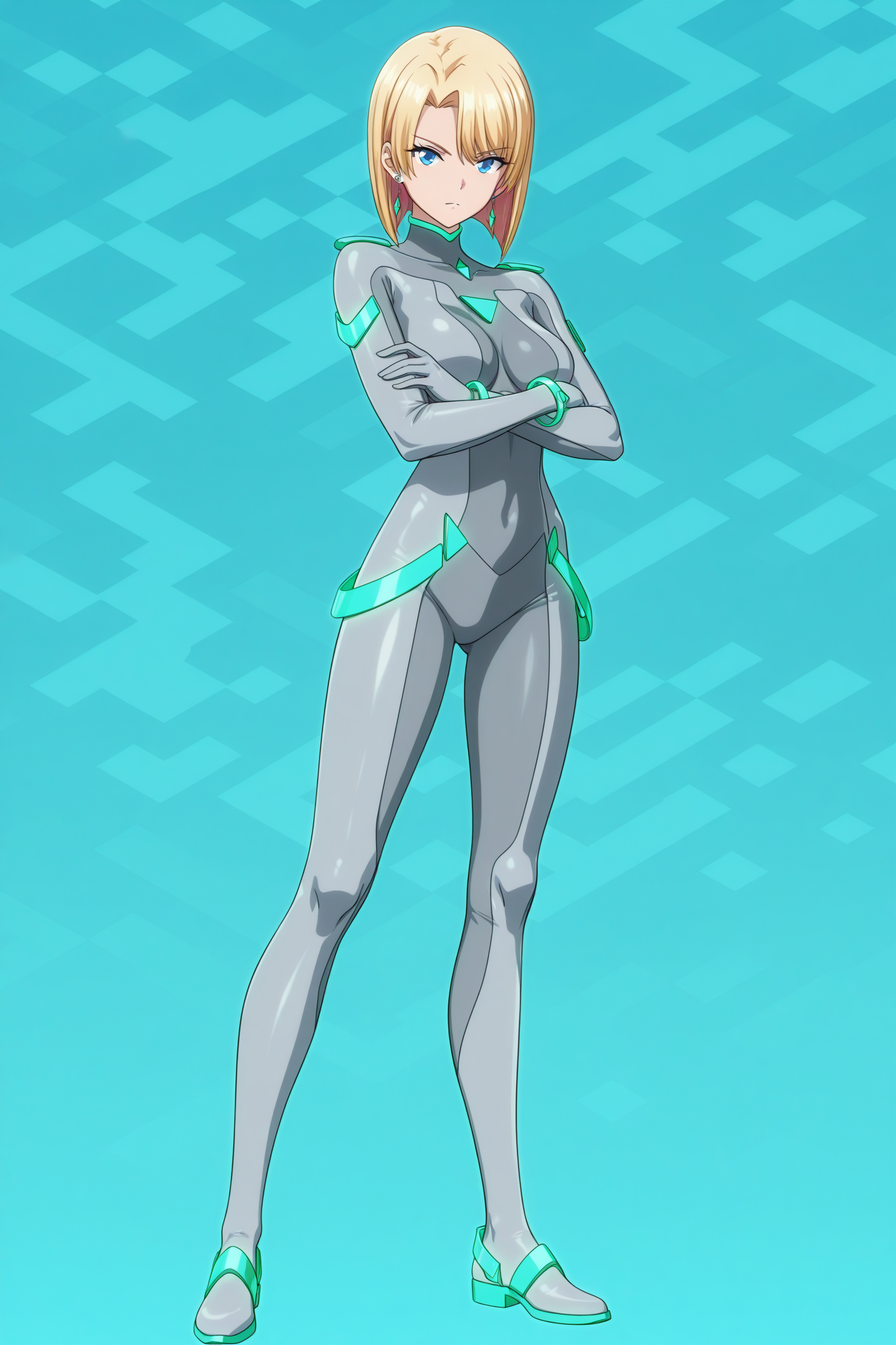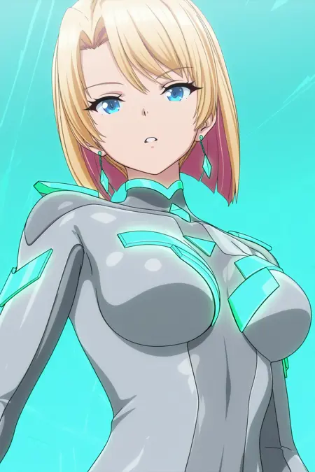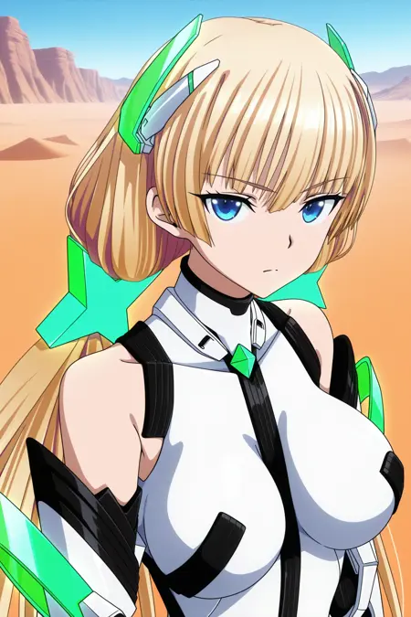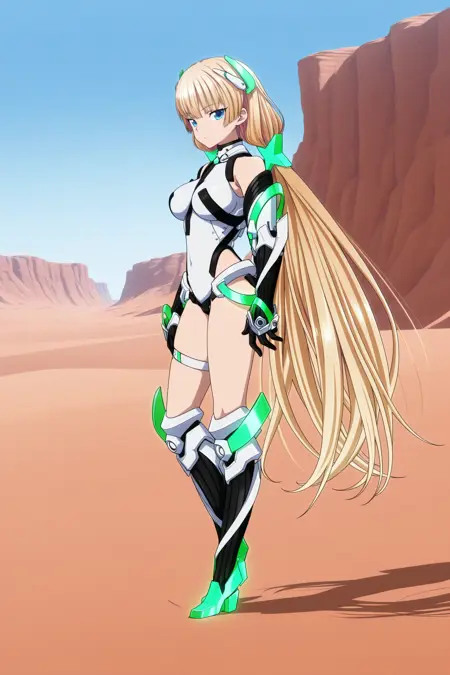angela balzac, 매우 긴 머리, 금발, 머리 장식, 헤어 액세서리, 더블 테일, 파란 눈, 어깨 노출, 메카 조종복, 레오타드, 하이레그, 팔꿈치 장갑, 갑옷 장갑, 무릎 부츠, 허벅지 스트랩, 하이힐 부츠, 갑옷 부츠