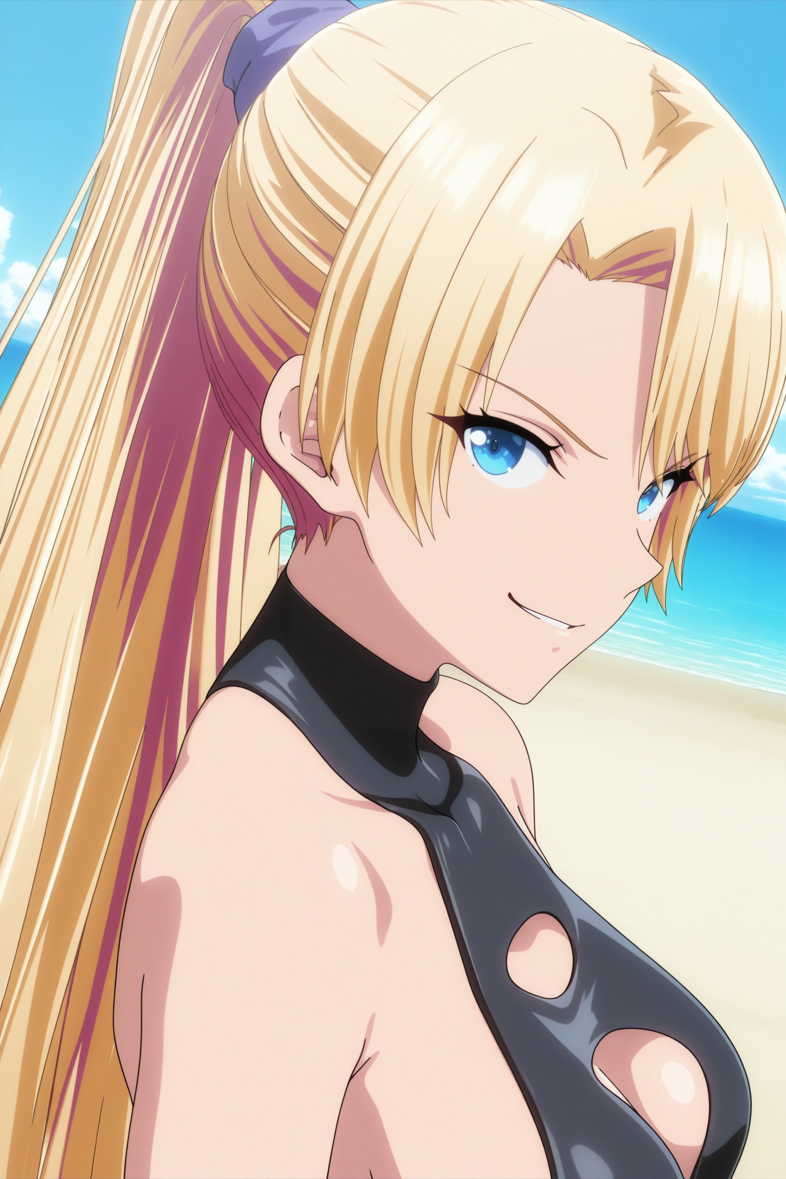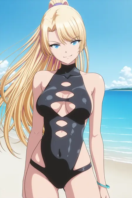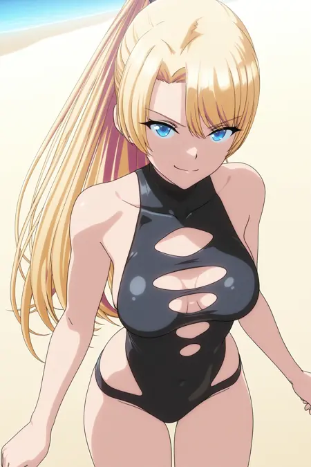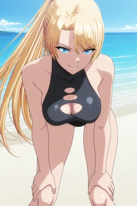 angeladeva, 긴 머리, 금발, 플랫테일, 머리띠, 갈라진 앞머리, 파란 눈, 검은 원피스 수영복, 옷 컷아웃