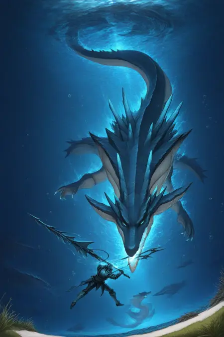 Turf War, Lagiacrus, sea serpent leviathan, glowing blue scales, electric aura, underwater battlefield, ocean abyss,