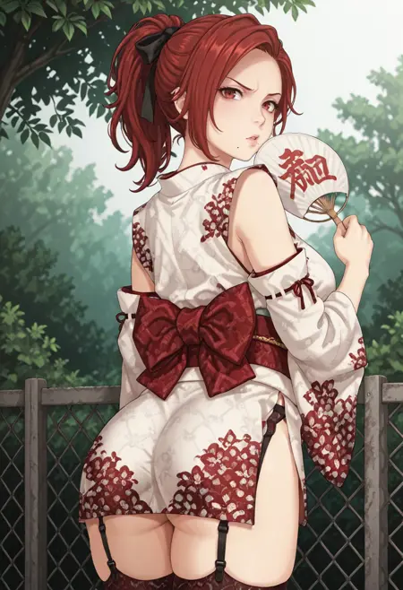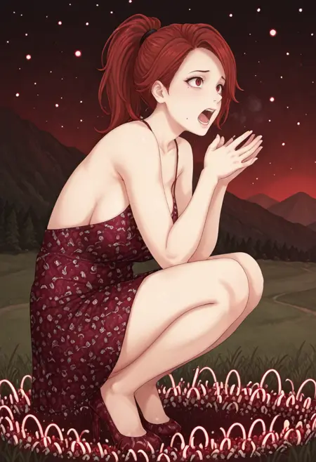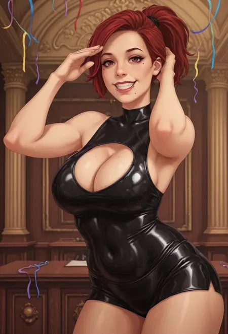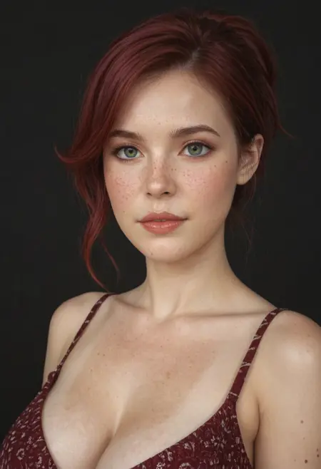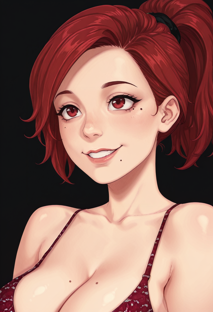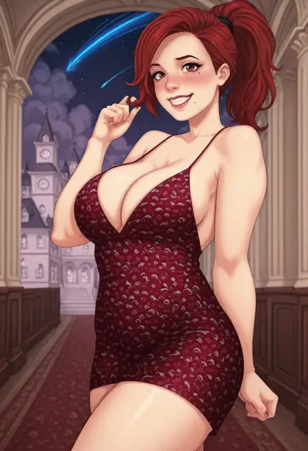- For a more game-accurate look, add: - red dress, red hair, mole under mouth
