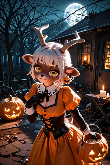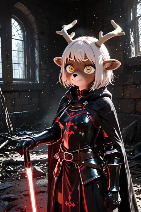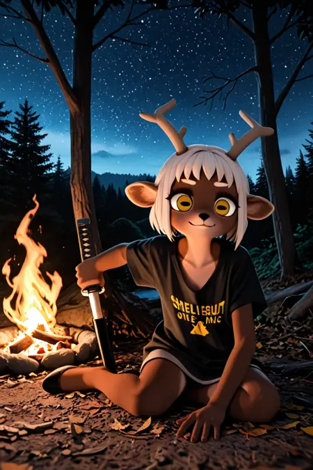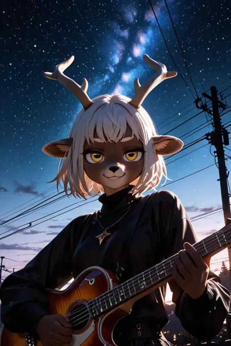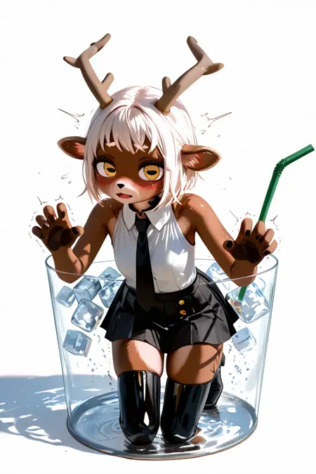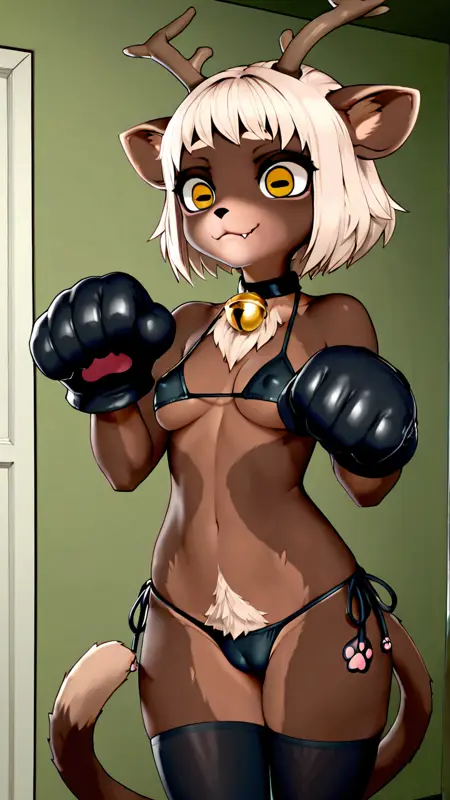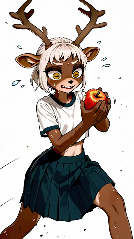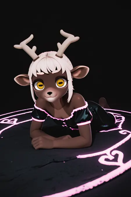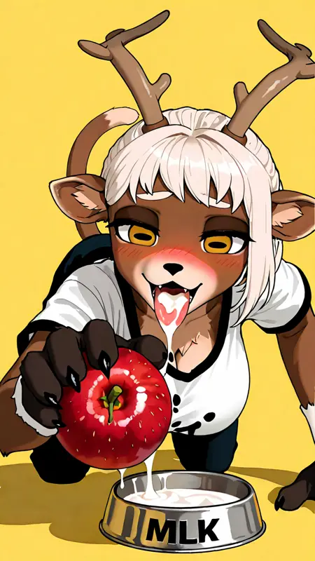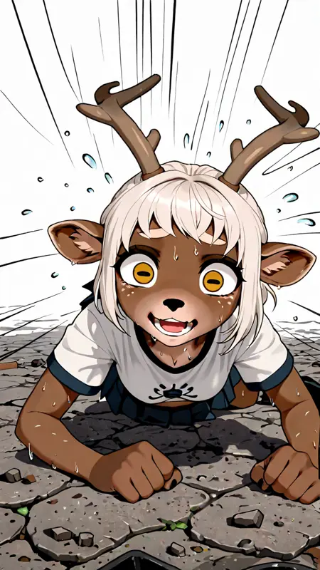 1girl, hairy female, deer ears, yellow eyes, horizontal pupils, female furry, short hair, white hair, horns, antlers, Small breasts