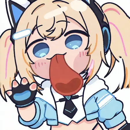 Example Prompt Elements : chibi, digital art, anime style, blonde hair, pink eyes, open mouth, large tongue, blushing, hair clips, blue hair clips, white frilled outfit, black and white outfit, paw gesture, cute, kawaii, exaggerated features, simple background, white background, pink blush, pink eye reflection, cartoonish, fantasy character, light skin, frilled collar, stylized, large head, small body, pastel colors, upper body, detailed eyes, hair strands, hair accessory, frilled sleeves, character portrait, close-up, expressive face, whimsical, playful, fantasy theme, cute expression, chibi style, detailed line work, soft shading, fantasy character design, anime character, kawaii art, fantasy genre, exaggerated proportions, childlike charmRecommended Negative Prompts: