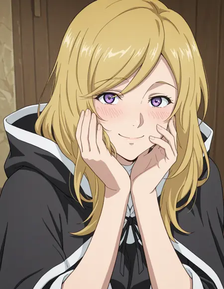 - tondemofranka, blonde hair, long hair, purple eyes, hooded cloak, black cloak