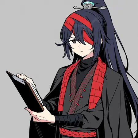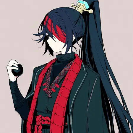 lord hong lu,black eyes,black hair,red bandage,bandage over left eye,hair ornament,high ponytail,