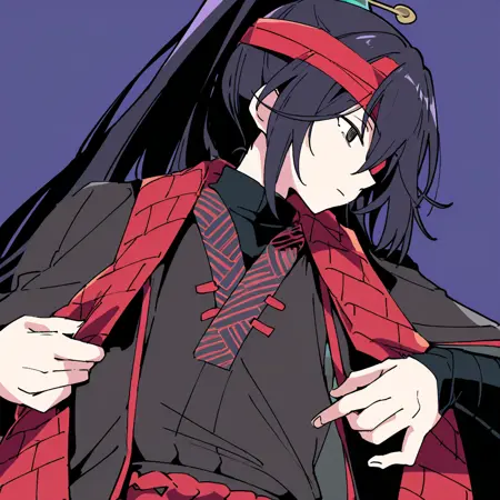 black vest,black sweater,red scarf,black coat on shoulders,red sash,black pants,black footwear,