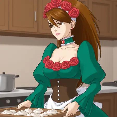 衣装タグ:花のヘアバンド、緑のドレス、フリル付き首輪、ジュリエット袖、長い袖、茶色のコルセット、白いエプロン、薔薇、赤いイヤリング、茶色のブーツ