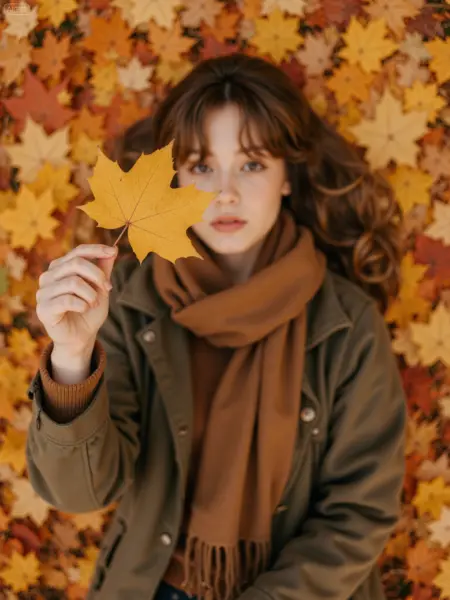 긴 직선 갈색 머리와 섬세한 얼굴 특징을 가진 여자, 황금빛 은행나무 잎 무더기를 바라보고 있다. 흰색 질감 있는 스웨터를 입고 있다. 배경은 부드럽게 흐릿하게 처리되어 그녀의 차분한 표정과 생동감 있는 단풍에 집중을 돕는다. 조명은 따뜻하여 풍경의 자연스러운 아름다움과 평온함을 강조한다.