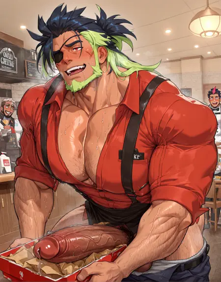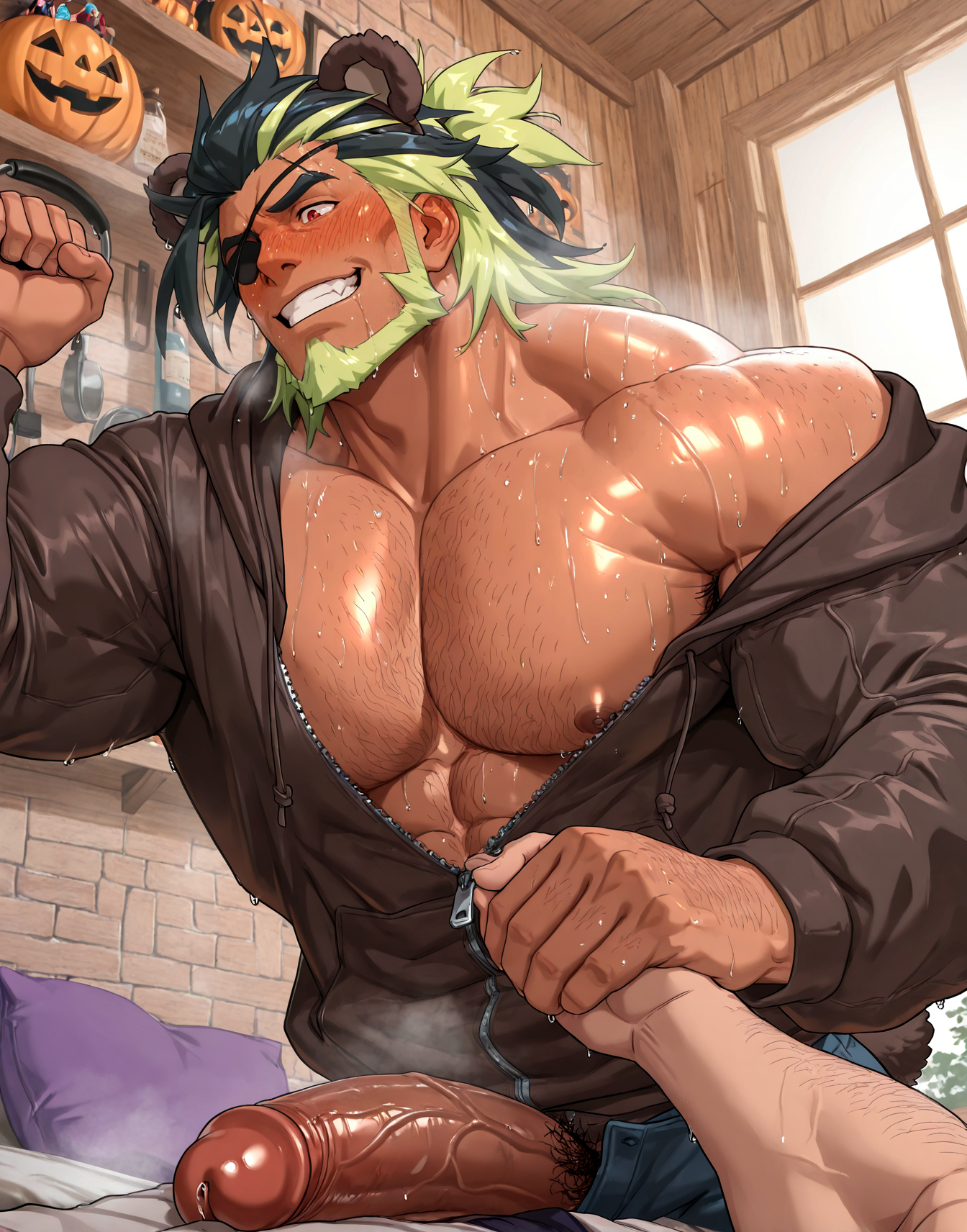 Base:muscular male,eyepatch,facial hair, multicolored hair, two-tone hair pectoral cleavage, full beard, red eyes,bara,hairy body,(black streaked hair:1.3,highlights_hair:1.2),