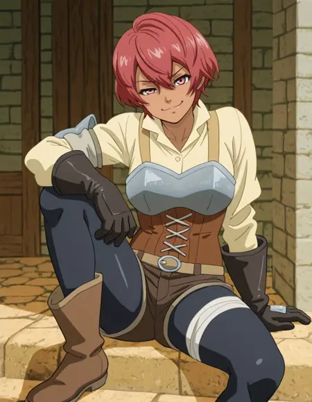 - tondemorita, 검은 피부의 여자, 빨간 머리, 단발, 분홍 눈, 노란 속옷, 가죽 코르셋, 가슴 갑옷, 어깨 보호대, 긴 가죽 장갑, 갈색 반바지, 검정 스판츠, 갈색 부츠, 한 다리에 붕대