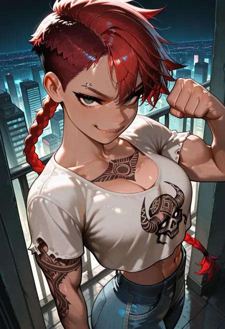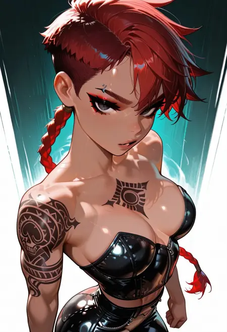 eyebrow piercing, red hair, very short hair, long braid ponytail, tomboy, sexy lips, medium breasts, fit, toned, dark eyes, tattoo on chest, sharp eyes
